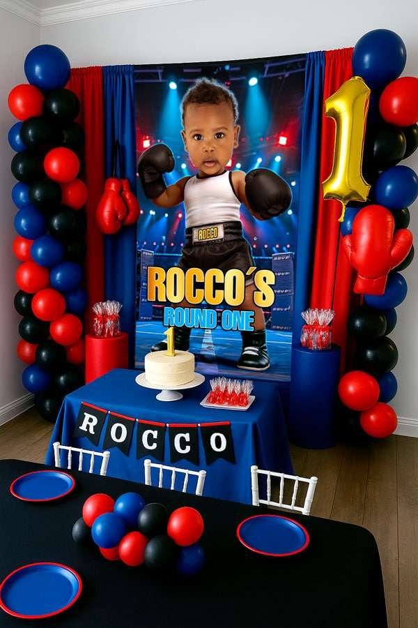 Color Palette: Red, black, white, gold, and blue — a bold and modern combination, perfect for a boxing-themed first birthday party. Red brings energy and passion, black adds a strong and elegant touch, white provides a fresh balance, and gold gives that champion vibe that makes the celebration feel extra special. Blue, increasingly popular in this theme, adds a vibrant contrast that softens the palette without losing impact.