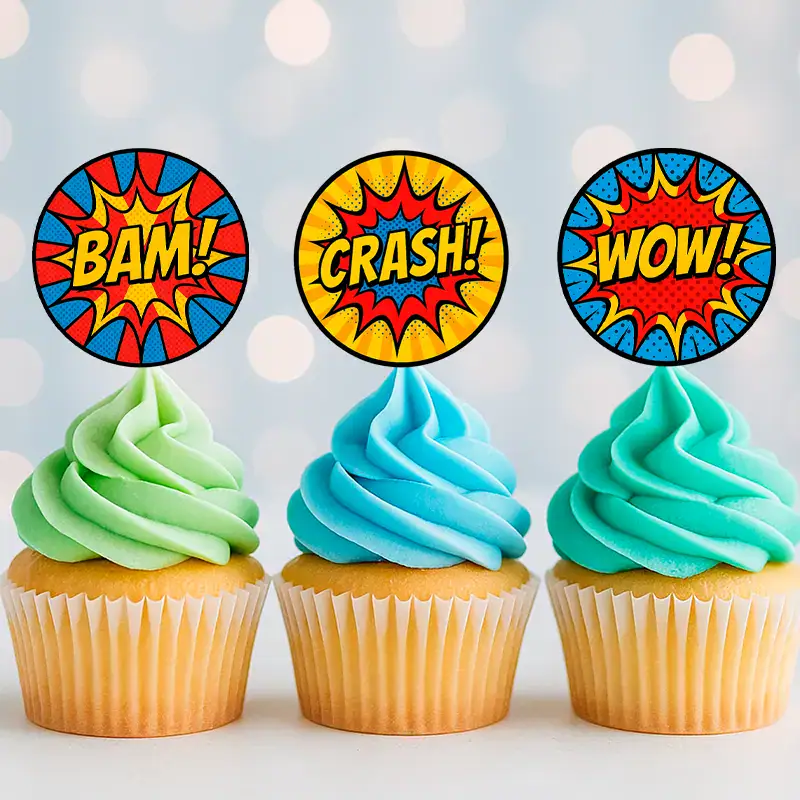 - 12 round toppers (2-inch size) in comic-inspired red, blue & yellow palette
