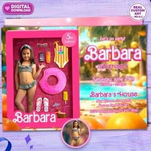 Custom Pool Party Doll-Themed Birthday Invitation for Girls featuring your child’s photo inside a vibrant doll box. Personalized, handmade & ready in 24h!