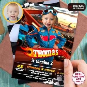 Make his birthday unforgettable with a Personalized Car Race Birthday Invitation with photo featuring your child’s photo — Ready in 24h.