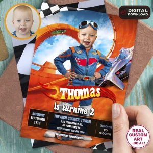 Create an unforgettable celebration with our Turbo Racing Cars Birthday Invitation. Personalized with your child’s photo, delivered in 24h.