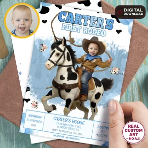 Say howdy to his First Rodeo! First Rodeo Photo Invitation for Boys, hand-edited, 5×7 vertical. High-res JPEG, proof in 24h.