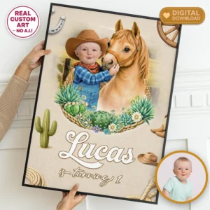 Custom Cowboy Baby Birthday Portrait – adorable western-themed artwork personalized with your child’s photo, hand-edited, delivered 24 hours.