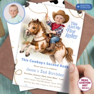 Say howdy to his First Rodeo! Custom 2nd Birthday Rodeo Invitation for Boys, hand-edited, 5×7 vertical. High-res JPEG, proof in 24h.