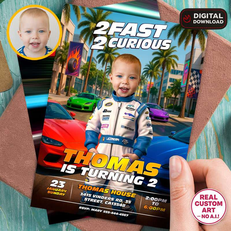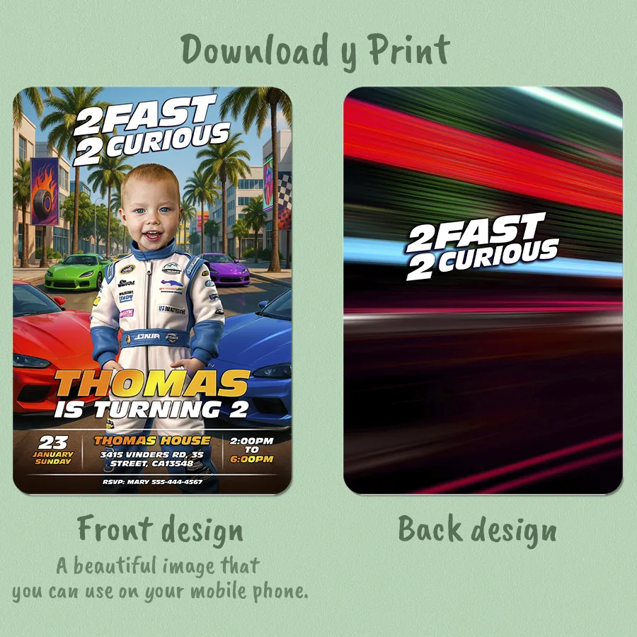You’ll get a high-resolution digital 2 Fast 2 Curious Blue Race Car Birthday Invitation personalized with your child’s photo, name, age, and party details. The standard size is 5×7 inches, delivered in JPEG and PDF formats for easy printing or digital sharing.