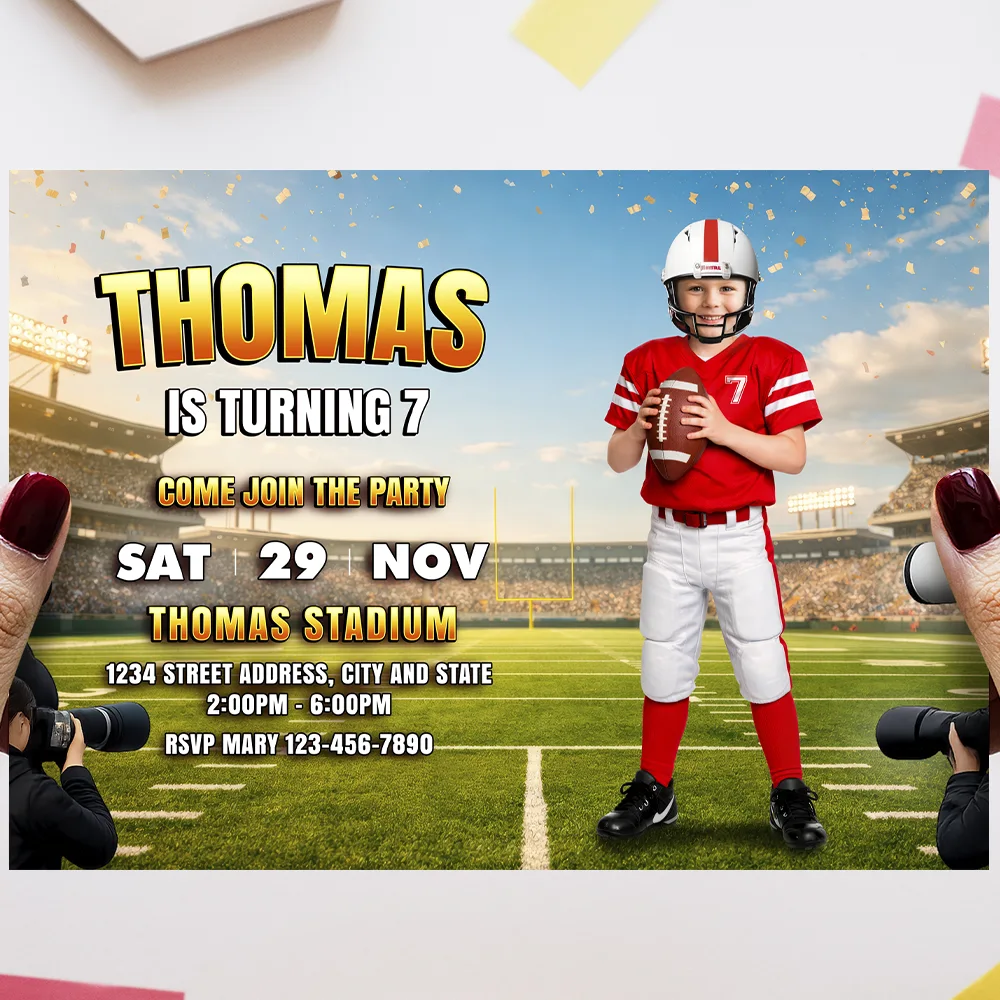 Turn your child into the MVP of the party with our 🏈 American Football Photo Invitation (Digital). This personalized invite transforms your child into a football star — wearing their favorite team’s colors, standing proud on the field, ready for kickoff!