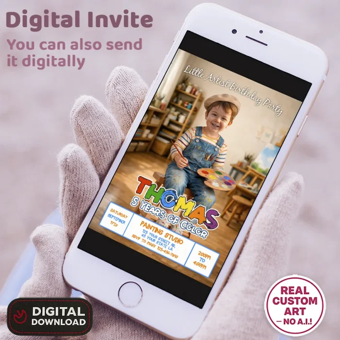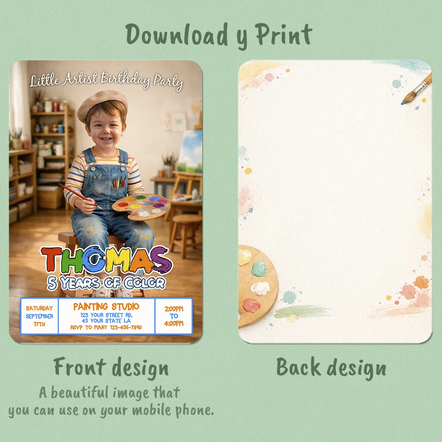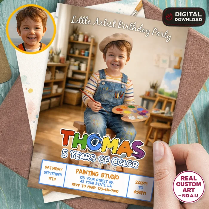 You’ll receive a high-resolution JPEG file (300 DPI) personalized with your child’s photo, name, age, and party details in a charming Little Artist theme. Standard size is 5×7 inches, ideal for printing or digital sharing.
