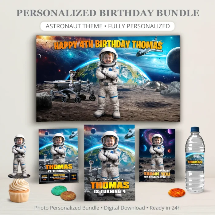 Designed to make party planning easy and stress-free, this bundle includes everything you need for a cohesive astronaut-themed birthday — all custom-made with your child’s photo and handcrafted by professional designers.