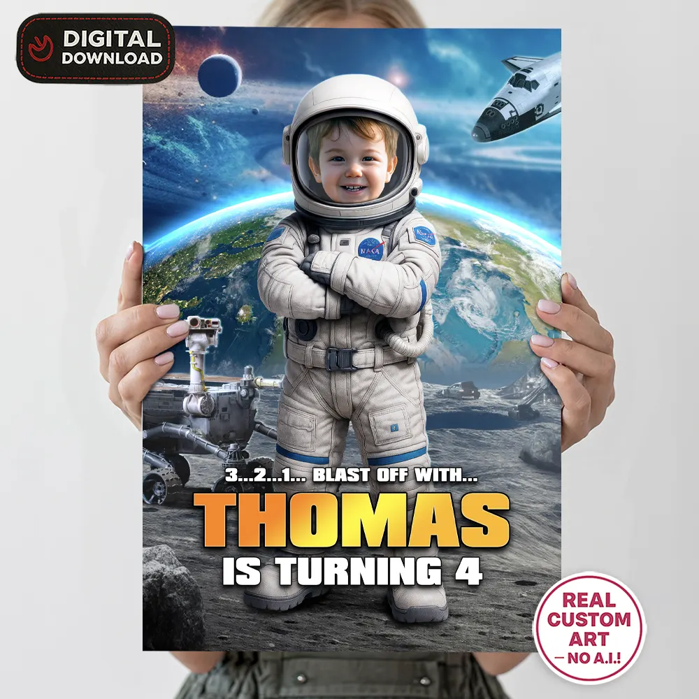 Every Astronaut Birthday Bundle is individually designed in Adobe Photoshop by a professional designer. Your child’s photo is carefully integrated with realistic lighting, shadows, and details to ensure a natural, polished result.