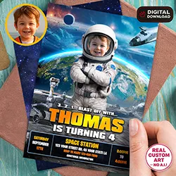 Custom Astronaut Birthday Invitation → https://alicemagicparty.com/product-category/astronaut-birthday-party/astronaut-invitations/