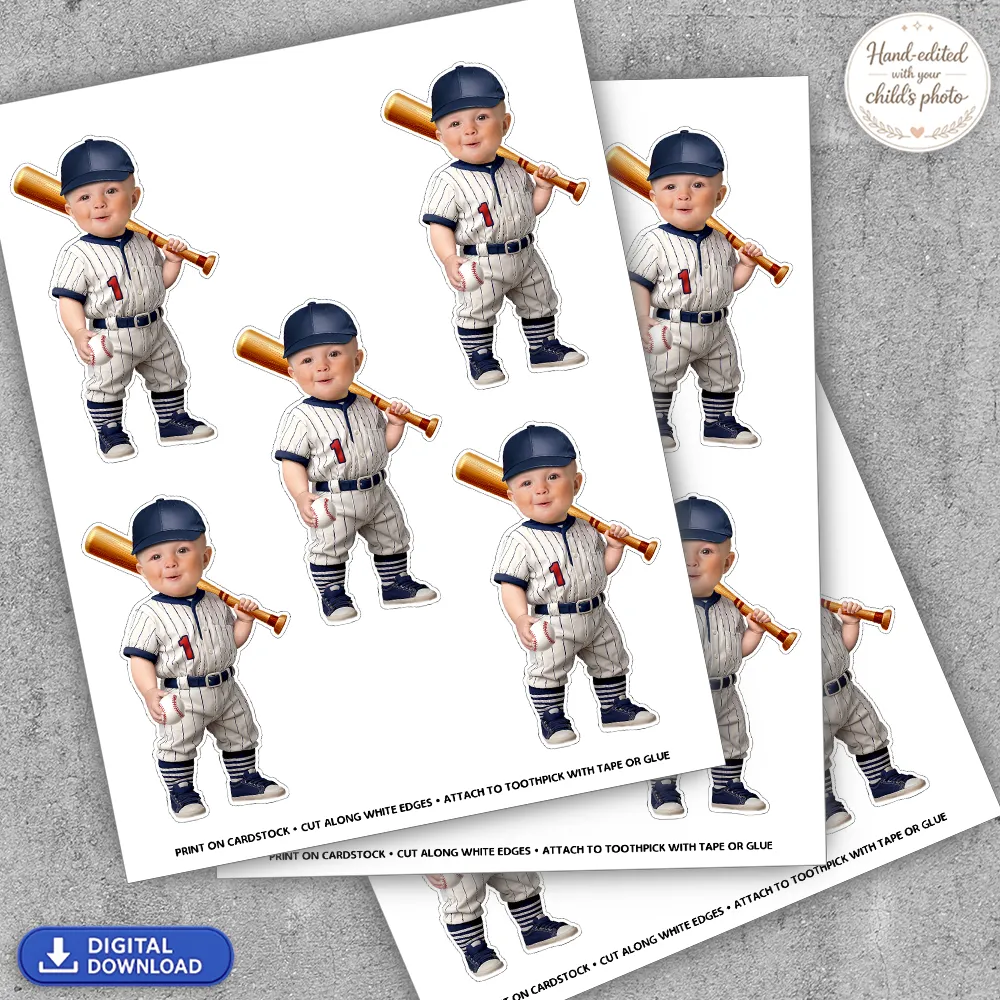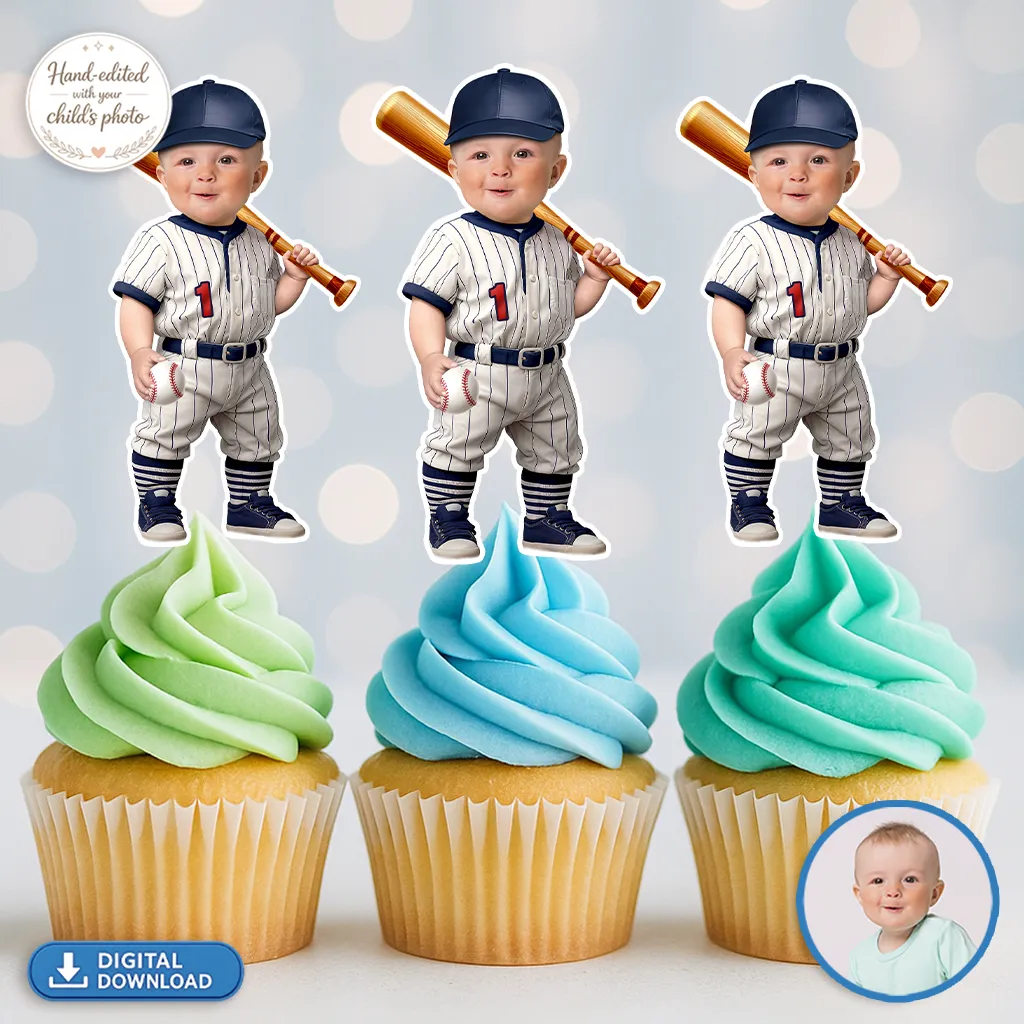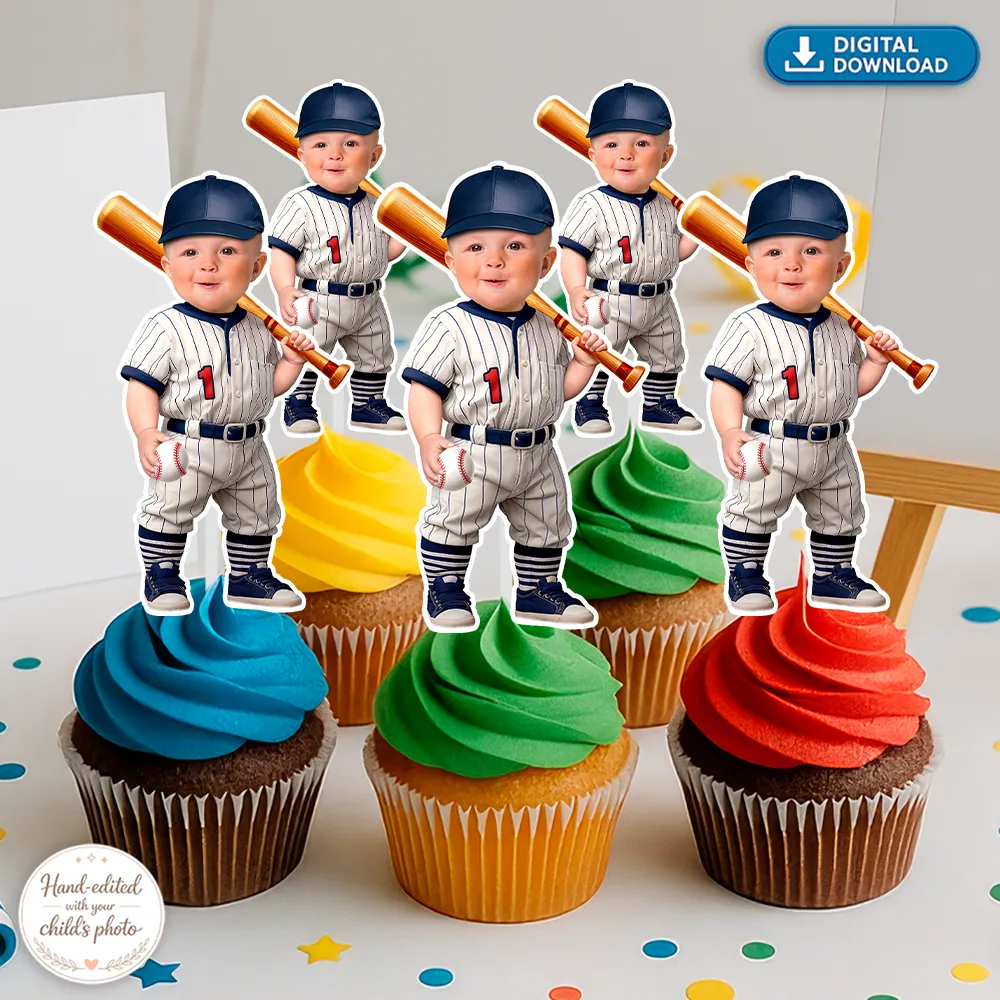 Your baby becomes the star baseball player on every cupcake — perfect for 1st and 2nd birthdays, sports themes, and classic baseball parties.