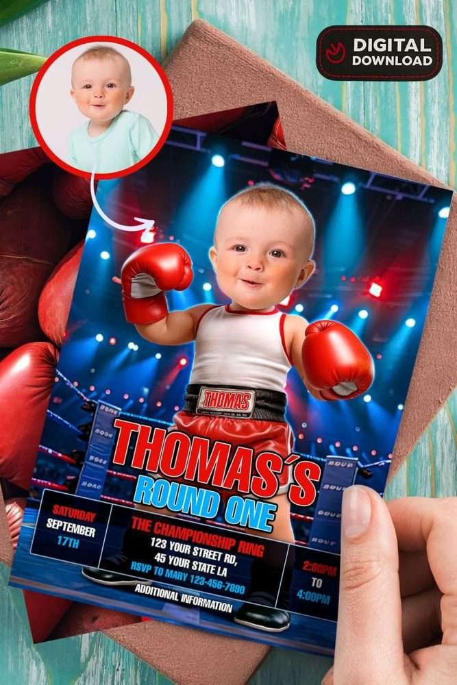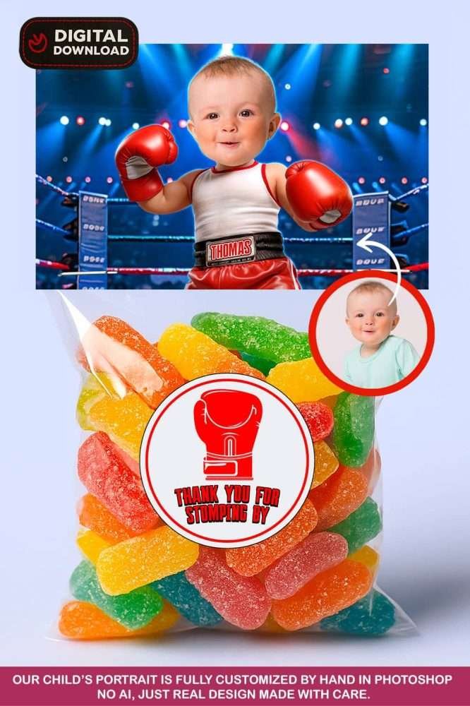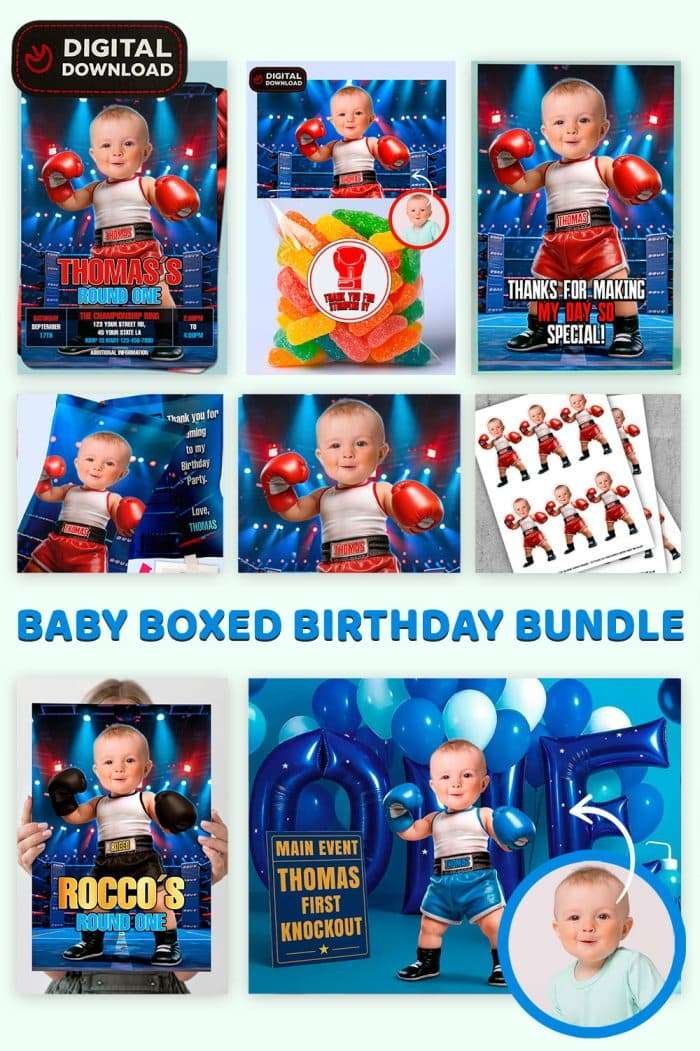 Celebrate your little champ’s big day with the Baby Boxer Birthday Party Bundle — a fully coordinated digital party set where your baby becomes the star of the ring! Every item in this fun and energetic collection features your child as an adorable mini boxing champion, ready to knock out smiles from every guest.