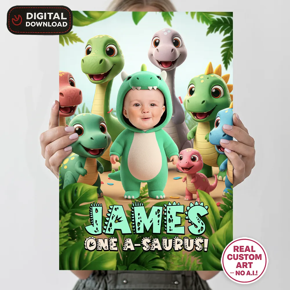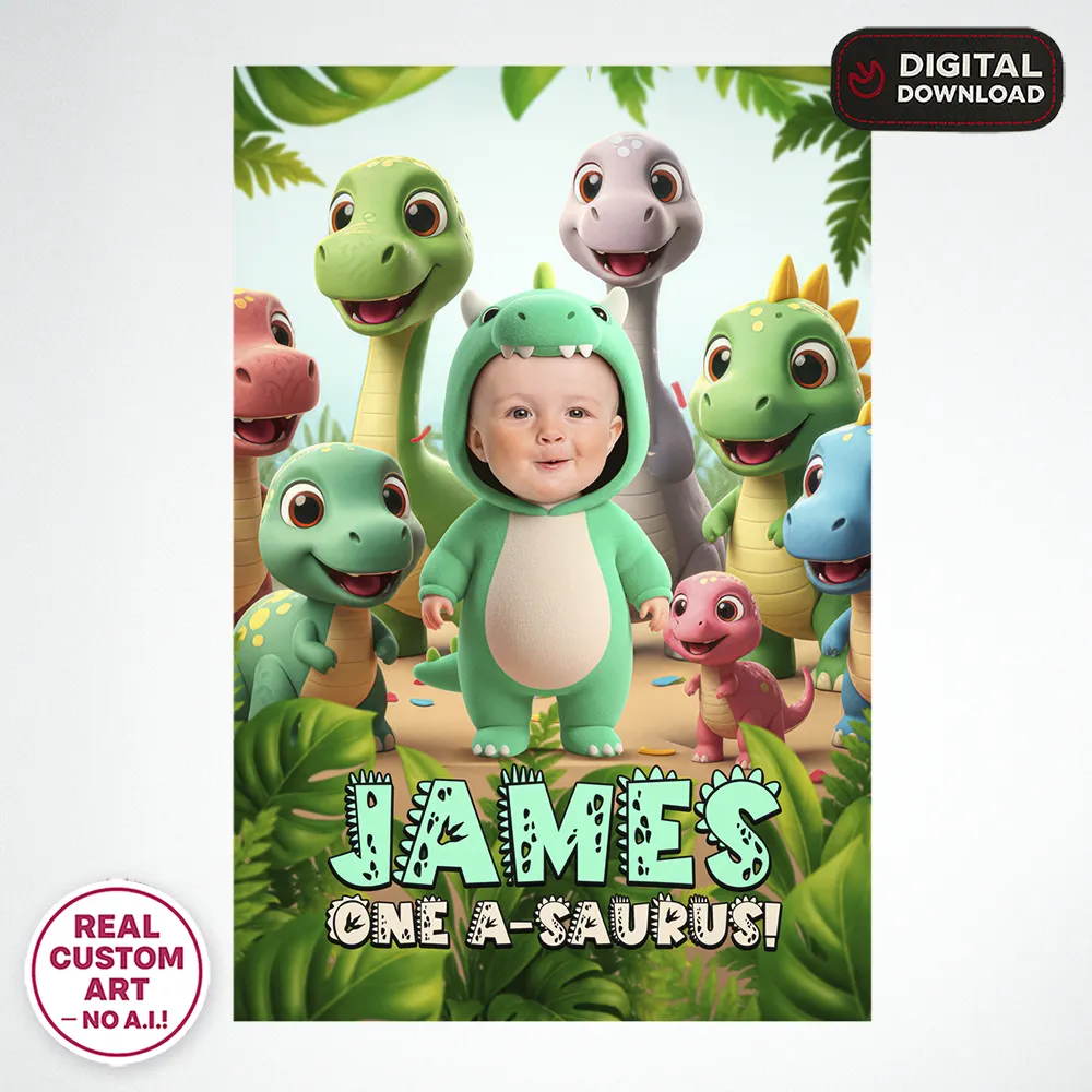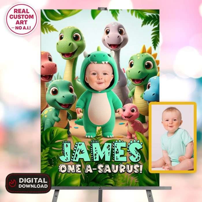 You’ll get a high-resolution JPEG file (300 DPI) personalized with your child’s photo, name, and age in a Baby Dinosaur Triceratops theme. Standard sizes include 8×10″, 11×14″, and 16×20″, perfect for printing and displaying at the party entrance.