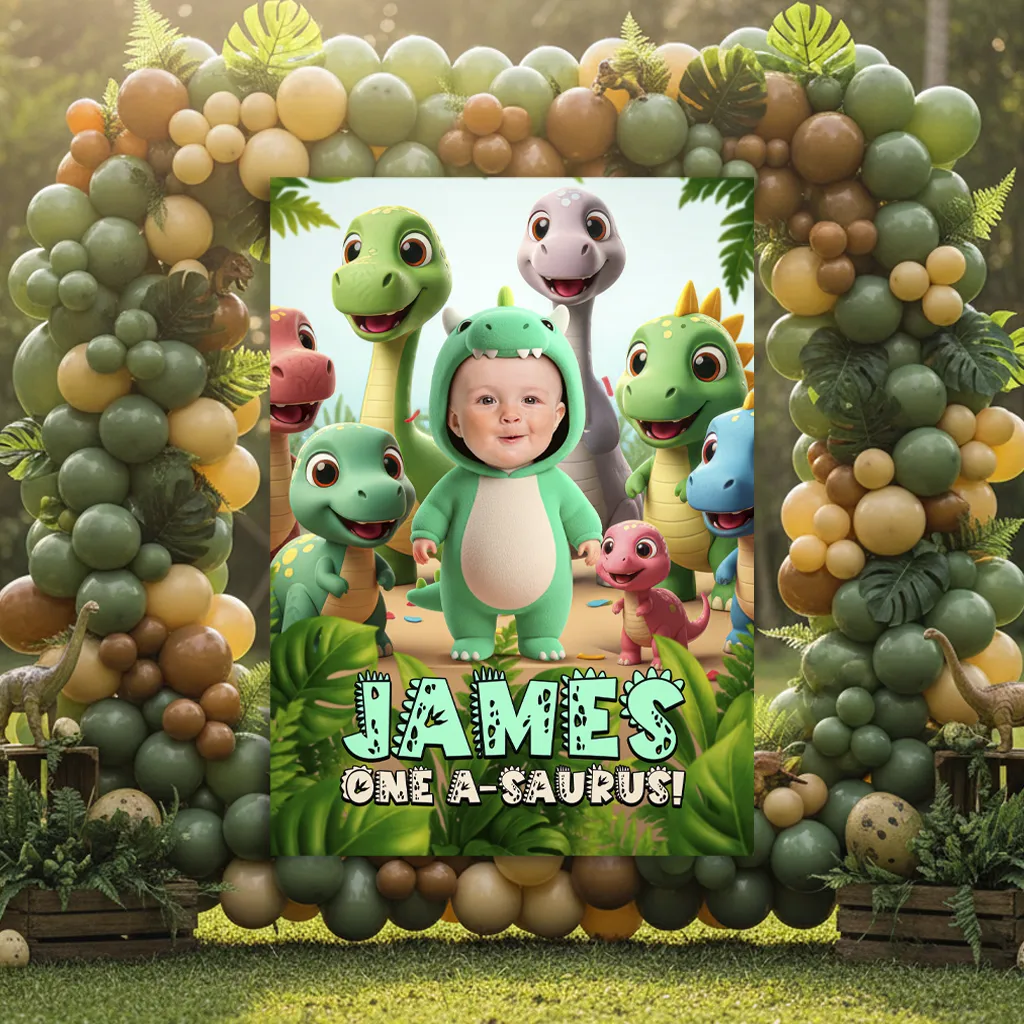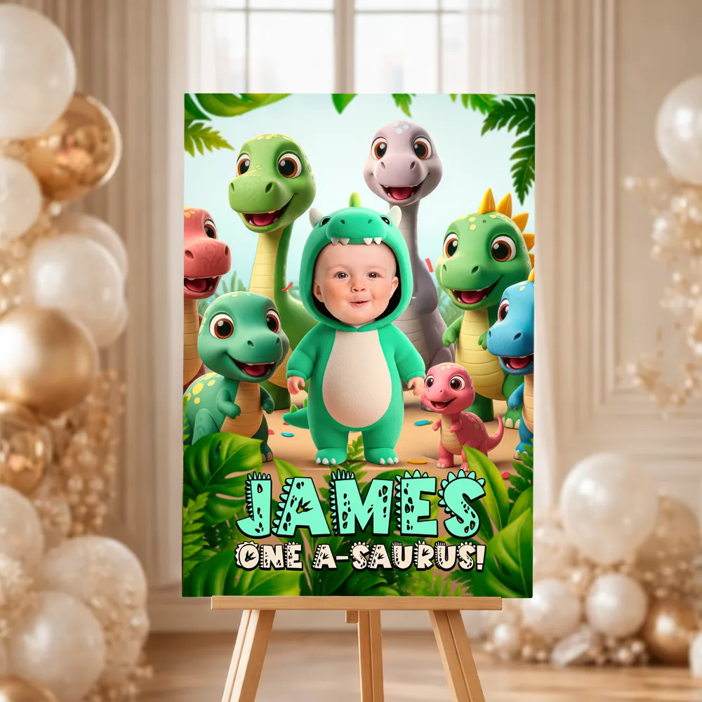 Baby Dinosaur Birthday Welcome Sign 🦖 – Welcome guests with a custom triceratops design featuring your child’s photo. Delivered 24h.