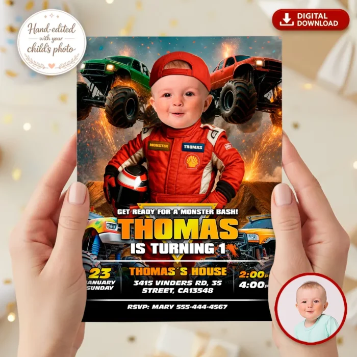 You’ll get a high-resolution JPEG file (300 DPI) personalized with your child’s name, age, and party details in a bold Baby Monster Truck off-road theme. Standard size is 5×7 inches, perfect for printing or digital sharing.
