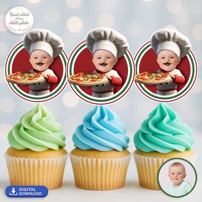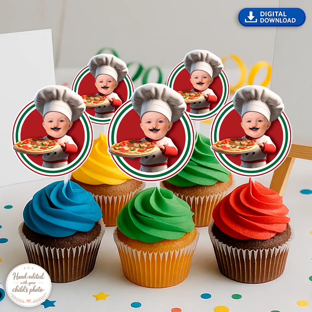 Your baby becomes the star pizza maker on every cupcake — perfect for 1st and 2nd birthdays, food themes, and playful party ideas.
