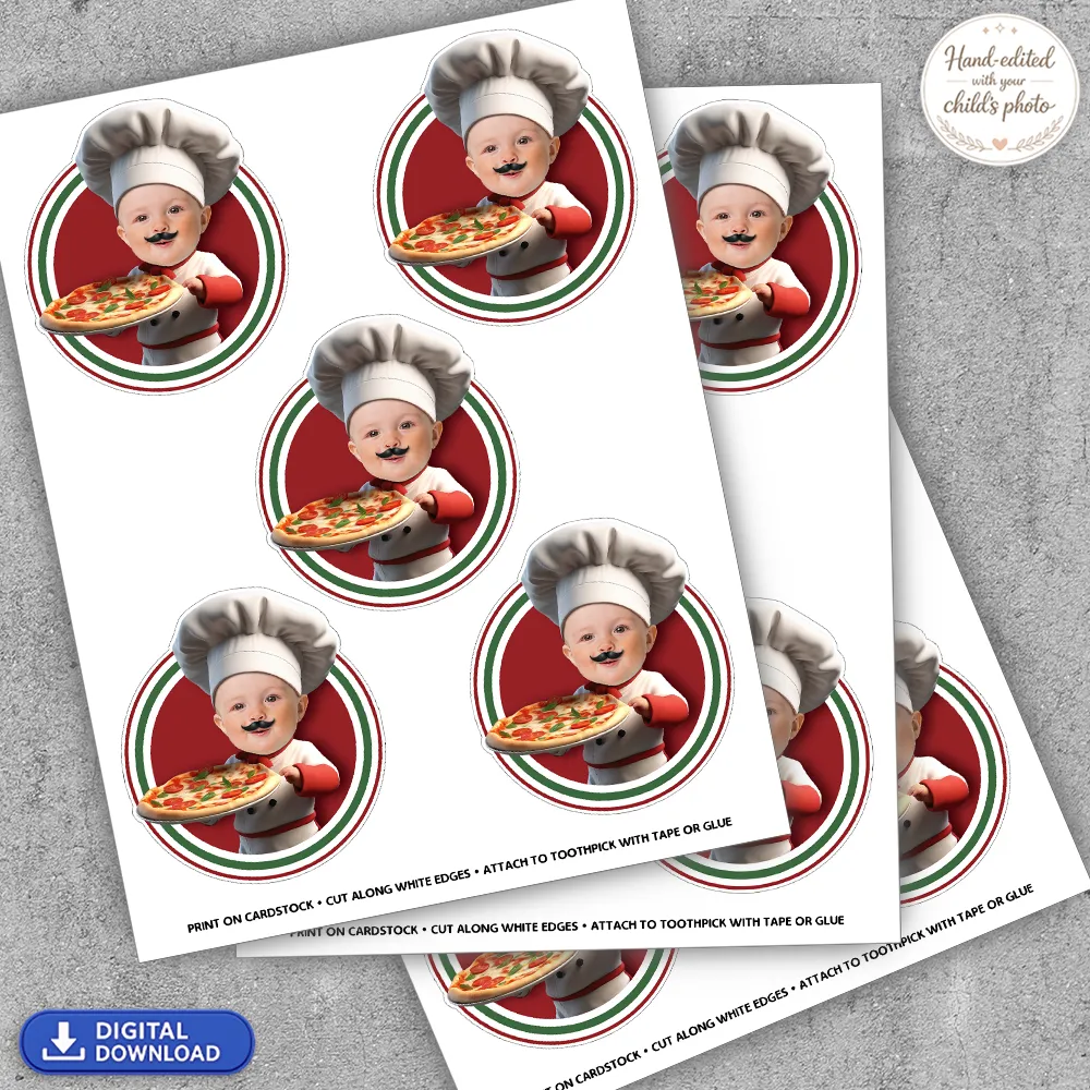 You’ll receive a high-resolution digital sheet of Baby Pizza Maker Cupcake Toppers personalized with your baby’s photo. Each page includes 6 toppers per US Letter size (8.5×11 in). Delivered as JPEG (PDF available upon request).