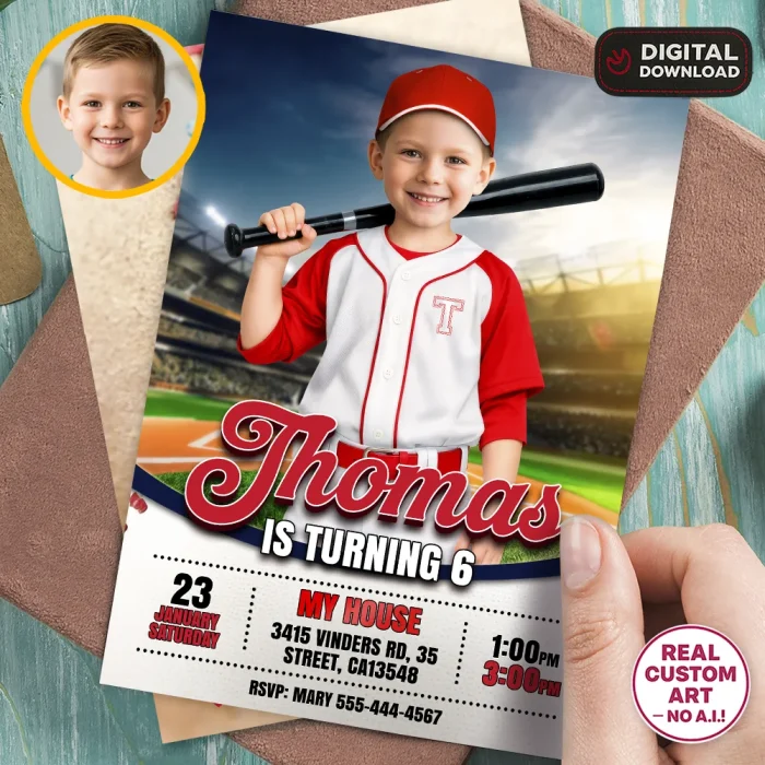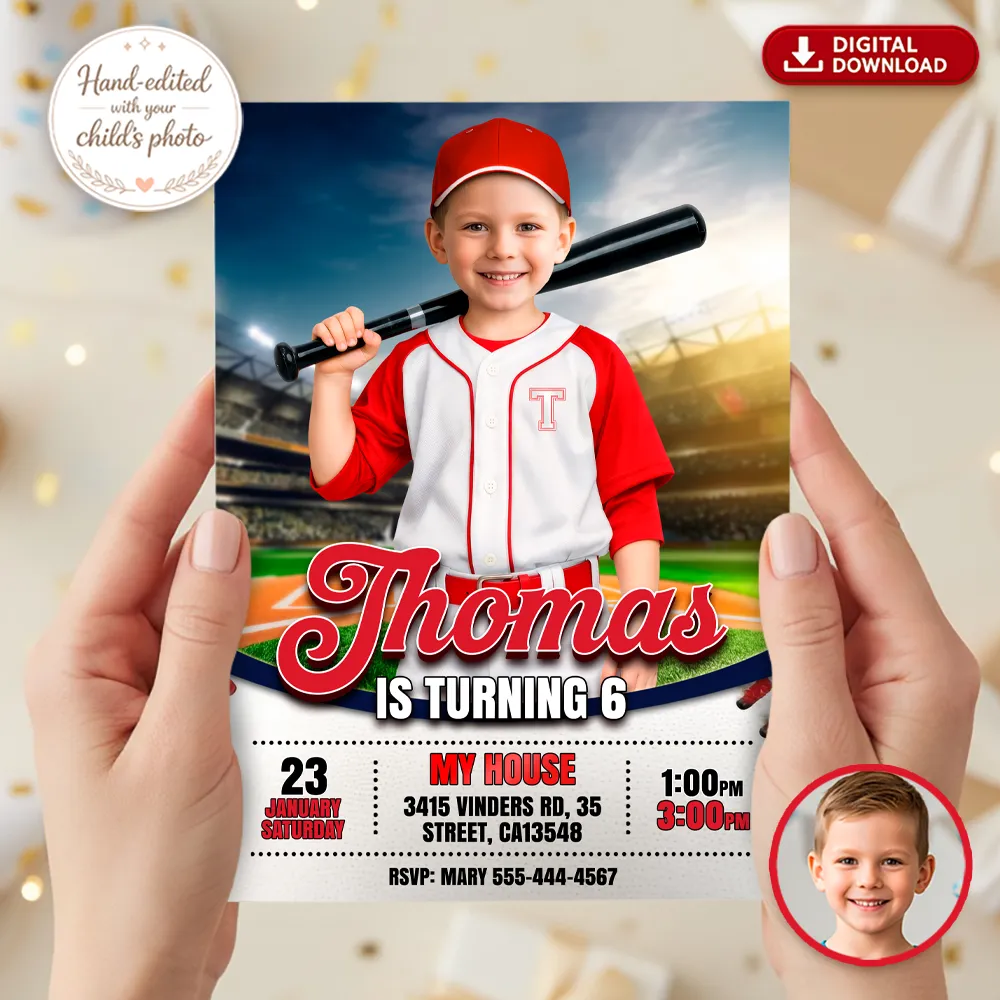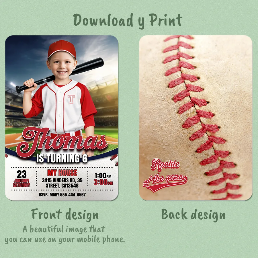 You’ll get a high-resolution JPEG file (300 DPI) personalized with your child’s photo, name, age, and party details in a playful “Rookie of the Year” baseball theme. Standard size is 5×7 inches, ideal for printing or digital sharing.