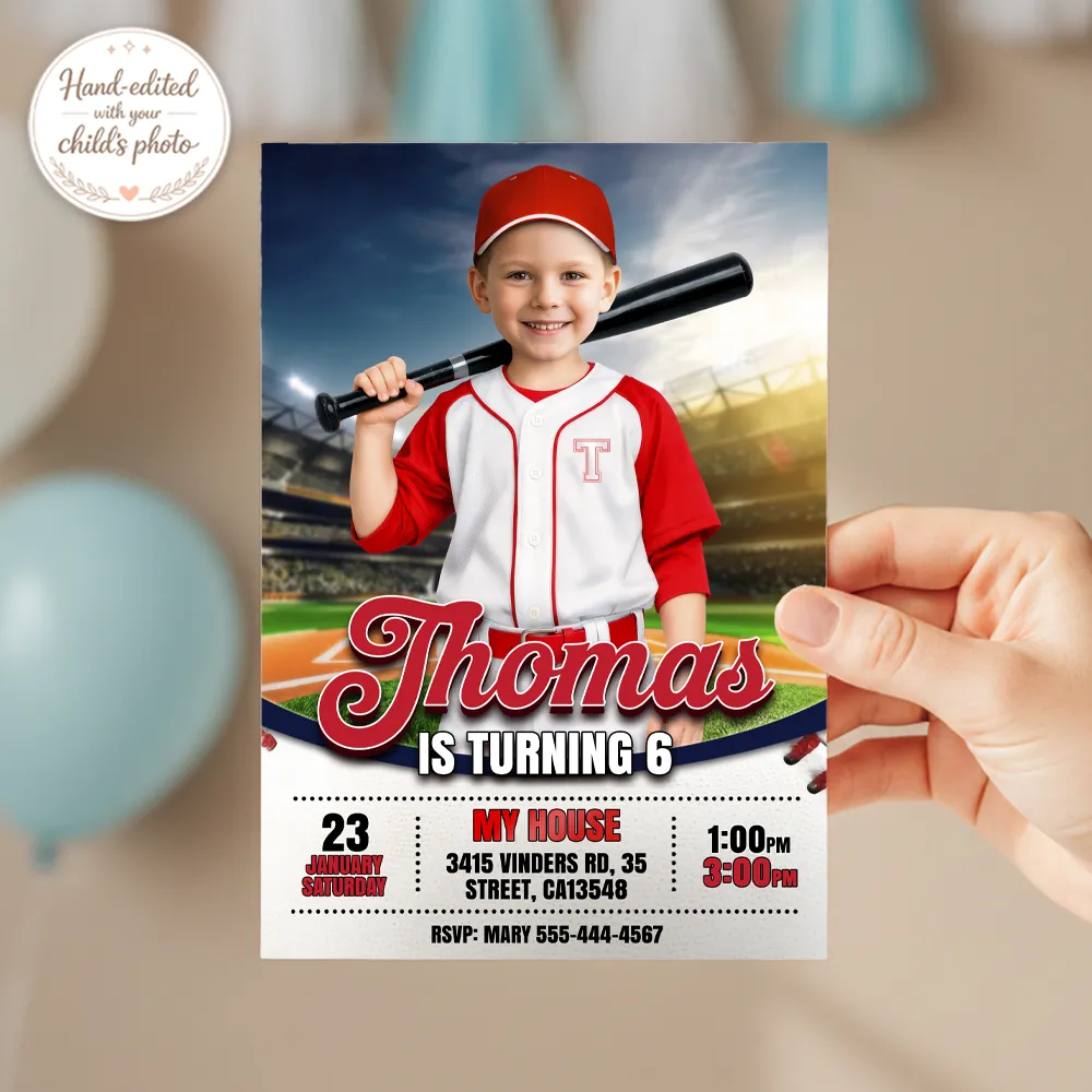 Get ready for a Grand Slam celebration! Our Baseball Invitation with Photo puts your child right on the home plate of a professional stadium. Featuring a bright, sunny game-day atmosphere, this design is perfect for any young athlete who loves the sport. Whether they are turning 5 or 10, this invitation makes them the star player of their own Major League event.