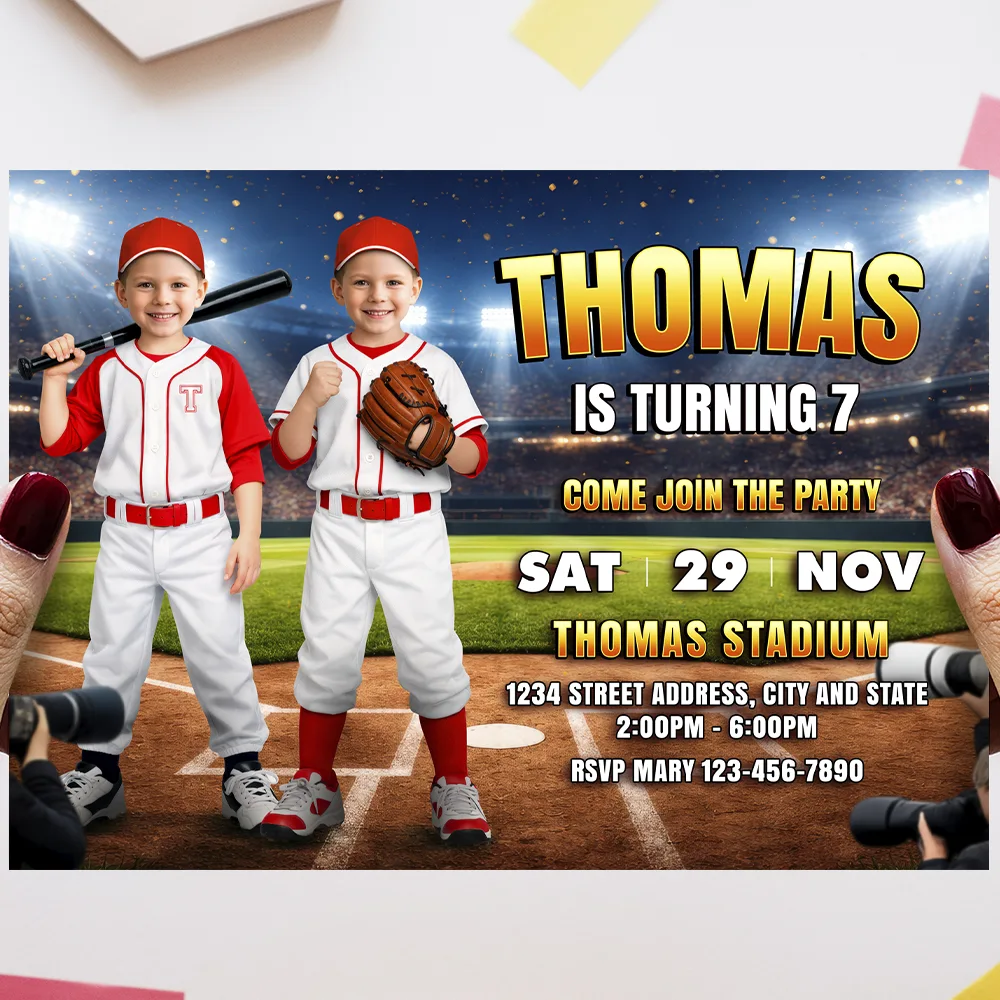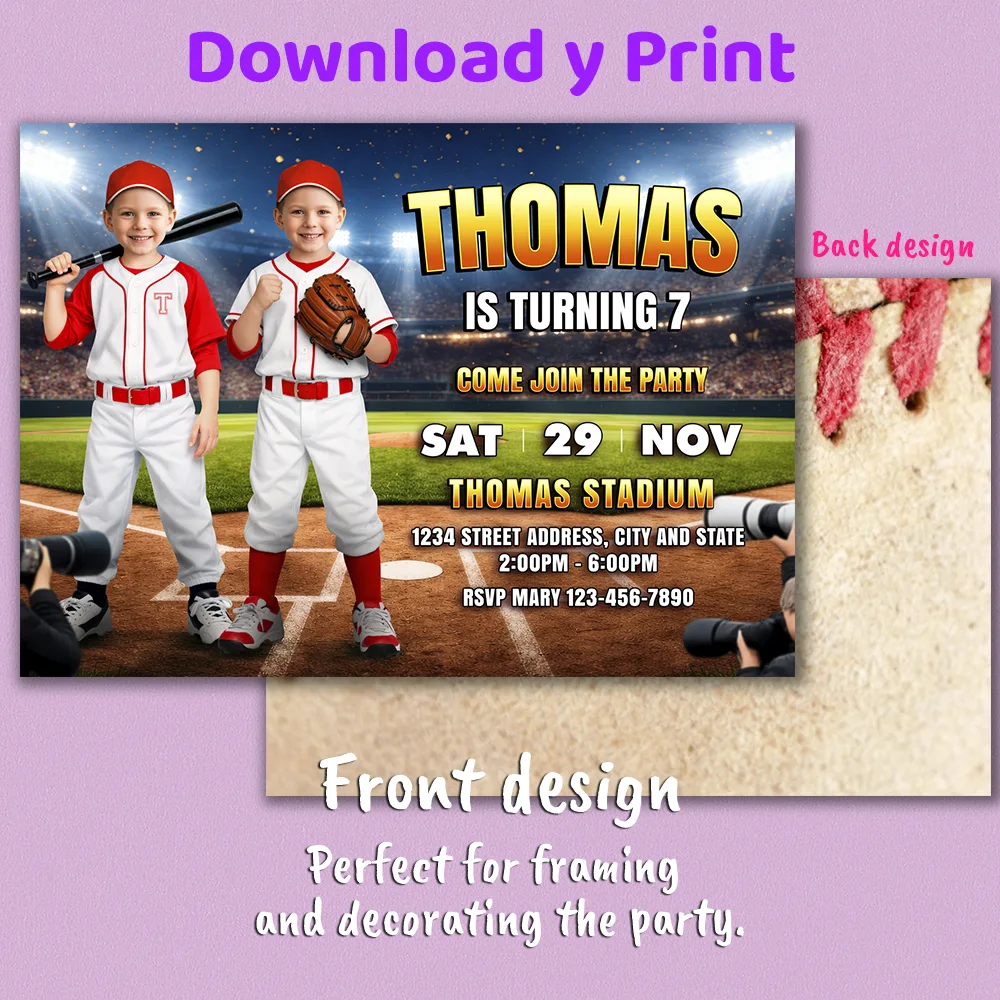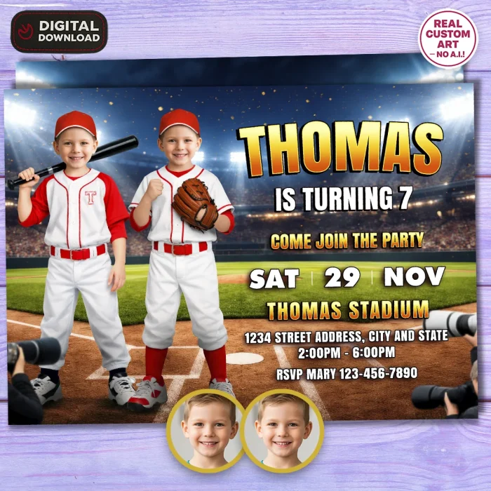 You’ll receive one high-resolution JPEG file (300 DPI) personalized with both children’s photos, names, ages, and shared party details in a coordinated baseball theme. Standard size is 5×7 inches, ideal for printing or digital sharing.
