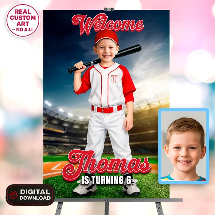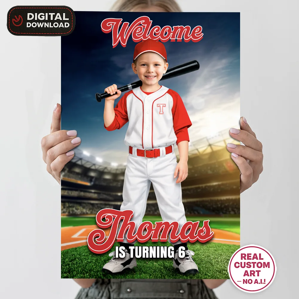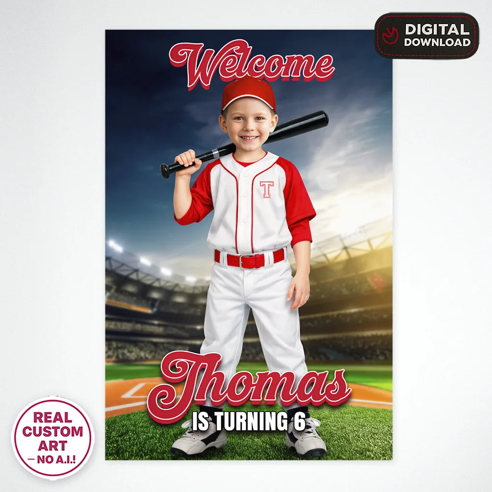 Baseball Welcome Sign with photo, hand-edited in Photoshop (no AI). 16×24” JPG + PDF on request. Delivered by email within 24 hours.
