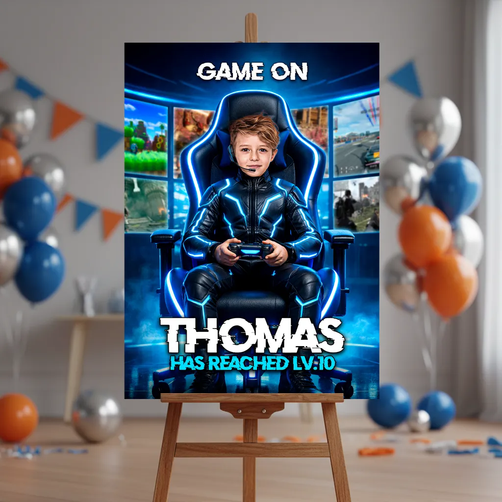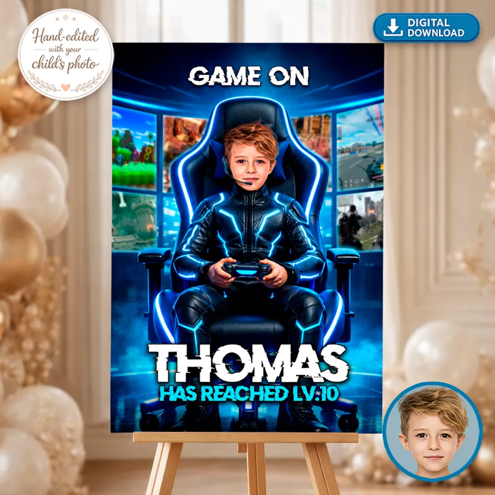 ✨ Level up your child’s birthday from the very first moment with our Personalized Blue Gamer Birthday Welcome Sign! Fully personalized with your child’s photo, this bold design transforms them into the star of an action-packed video game adventure — the ultimate way to greet your guests and set the mood for an unforgettable celebration.