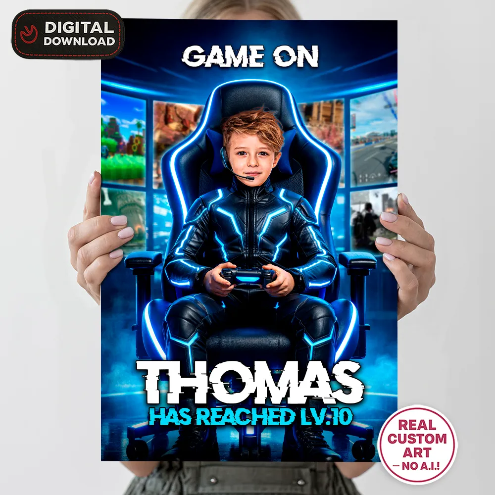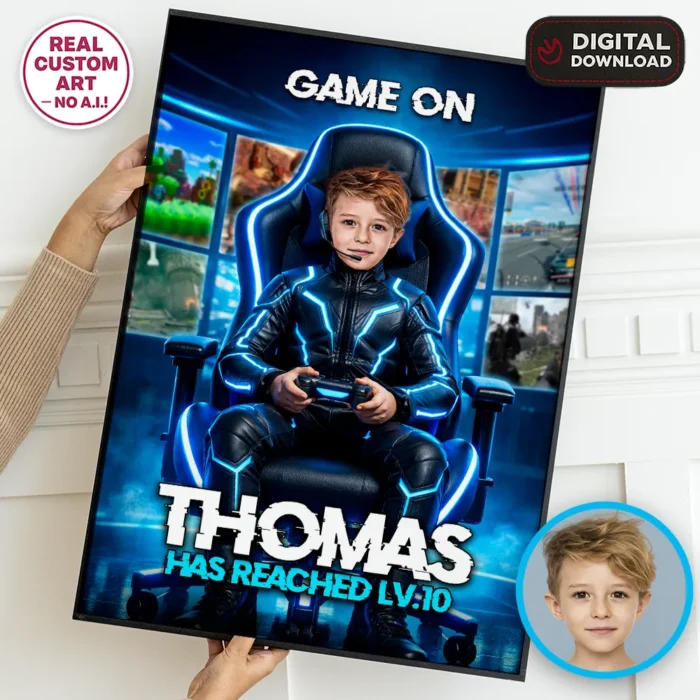 Our designer manually edits and integrates your child into the gaming-themed design.