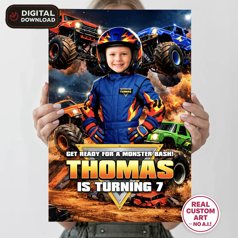 Yes. We can adapt the colors of the monster truck, background, fonts, or effects to match your party palette perfectly. Just mention your preferred colors when sending your details.