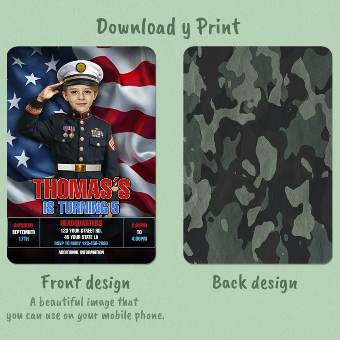 • Fully Personalized – Your child’s face and party details integrated into a realistic army scene.
