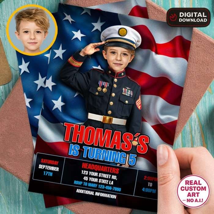 Make your child’s party epic with our Custom Army Marine Birthday Photo Invitation – fully personalized, handcrafted, and delivered in 24 hours.