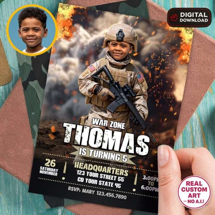 • Fully Personalized – Your child’s face and party details integrated into a realistic army scene.