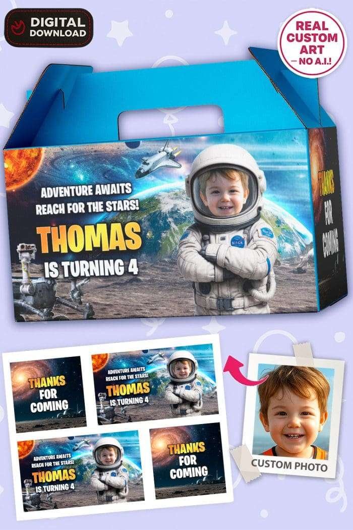 Add a cosmic touch with our Custom Astronaut Birthday Gable Box Labels. Space-themed digital favor stickers, personalized and ready to print at home.