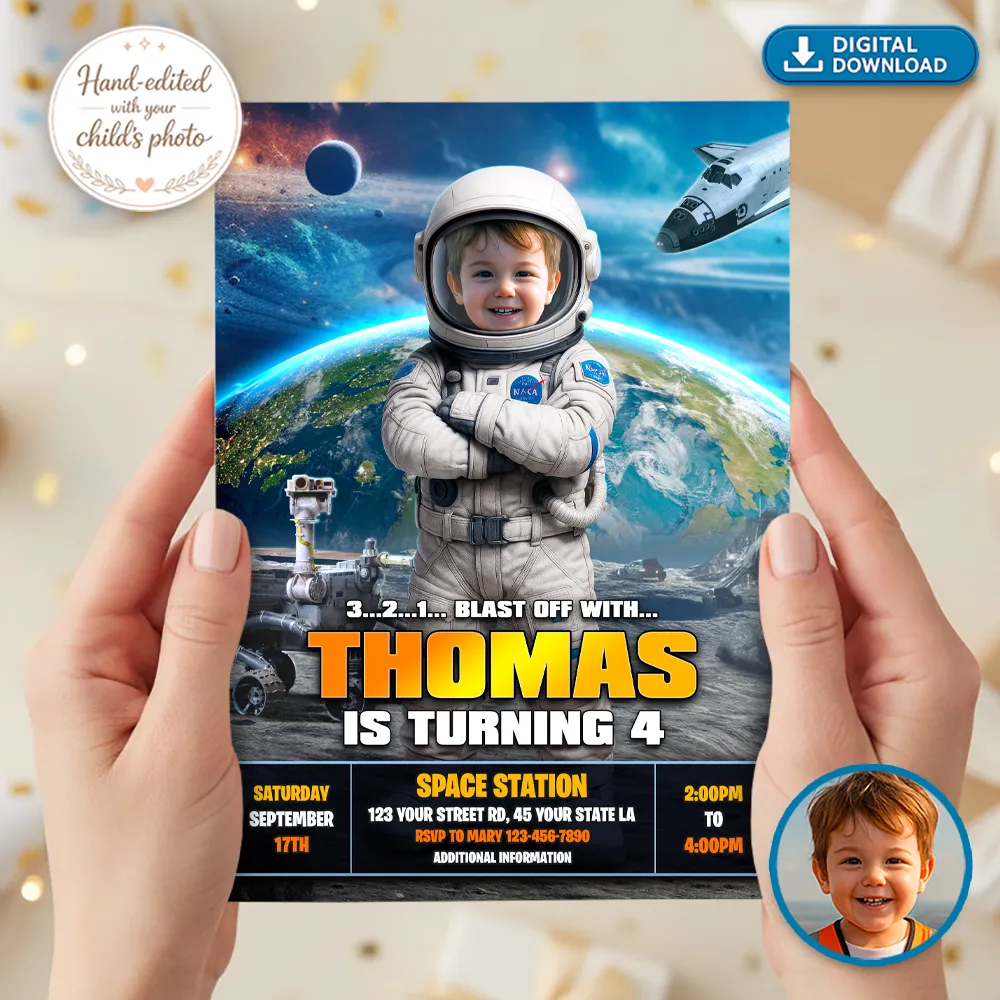You’ll get a high-resolution digital Astronaut Space Theme Birthday Invitation personalized with your child’s photo, name, age, and party details. The standard size is 5×7 inches, delivered in JPEG and PDF formats for easy printing or digital sharing.