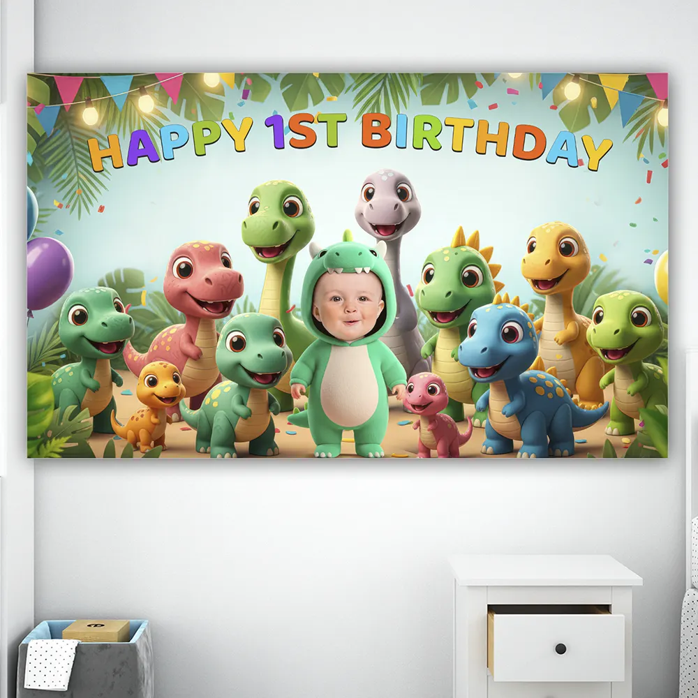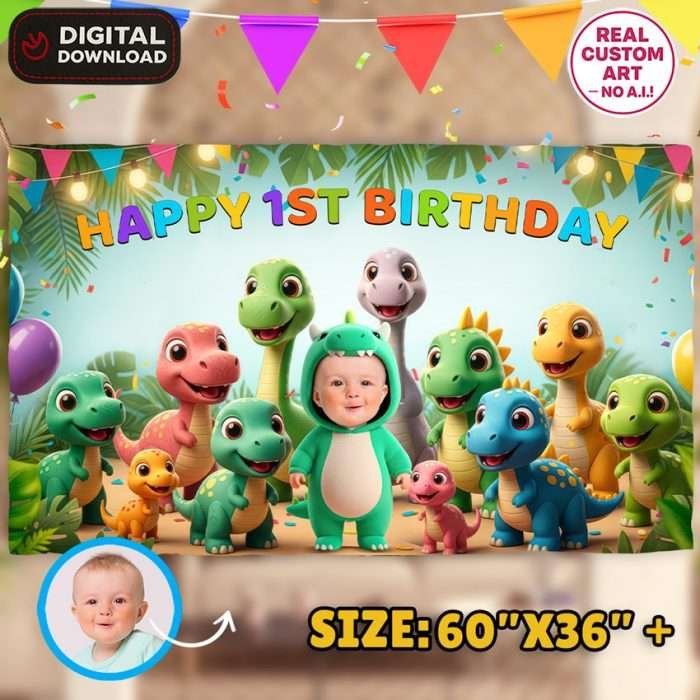 Our Custom Baby Dinosaur Birthday Banner is fully personalized with your child’s photo, placing them at the center of a playful prehistoric scene. With bold design and Jurassic vibes, this banner creates an unforgettable backdrop for photos, party décor, and memories that will last a lifetime.Every banner is carefully handcrafted by a professional designer using Adobe Photoshop — never AI or automated templates. Your baby’s photo is seamlessly integrated into a charming triceratops-themed scene, with expert retouching, realistic shadows, and vibrant detail.This isn’t just a decoration — it’s a one-of-a-kind keepsake that transforms your party into a dinosaur adventure to remember.