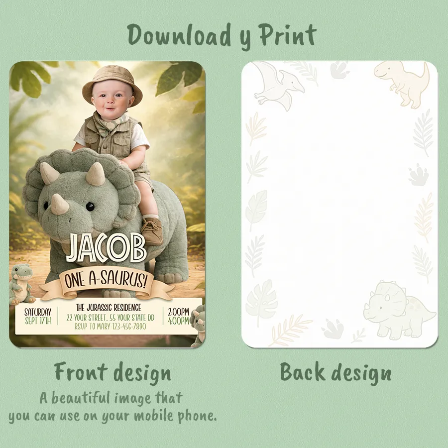 You’ll get a high-resolution JPEG file (300 DPI) personalized with your child’s photo, name, age, and party details in a cute Baby Dinosaur Triceratops theme. Standard size is 5×7 inches, ideal for printing or digital sharing.