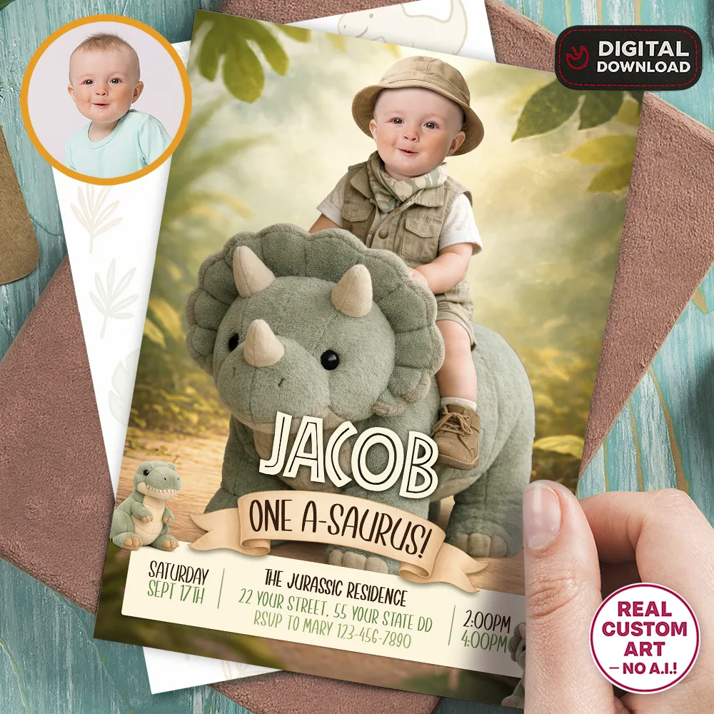 Perfect for first birthdays (“Roaring One” 🎉), but fully customizable for any age, this dinosaur-themed invitation isn’t just a file — it’s a keepsake you’ll treasure long after the celebration. Professionally designed by hand, with no templates or AI shortcuts, every detail is blended carefully to showcase your child in a realistic dino adventure. Whether you share it digitally or print it for guests, it’s the easiest way to roar excitement into your child’s big day.