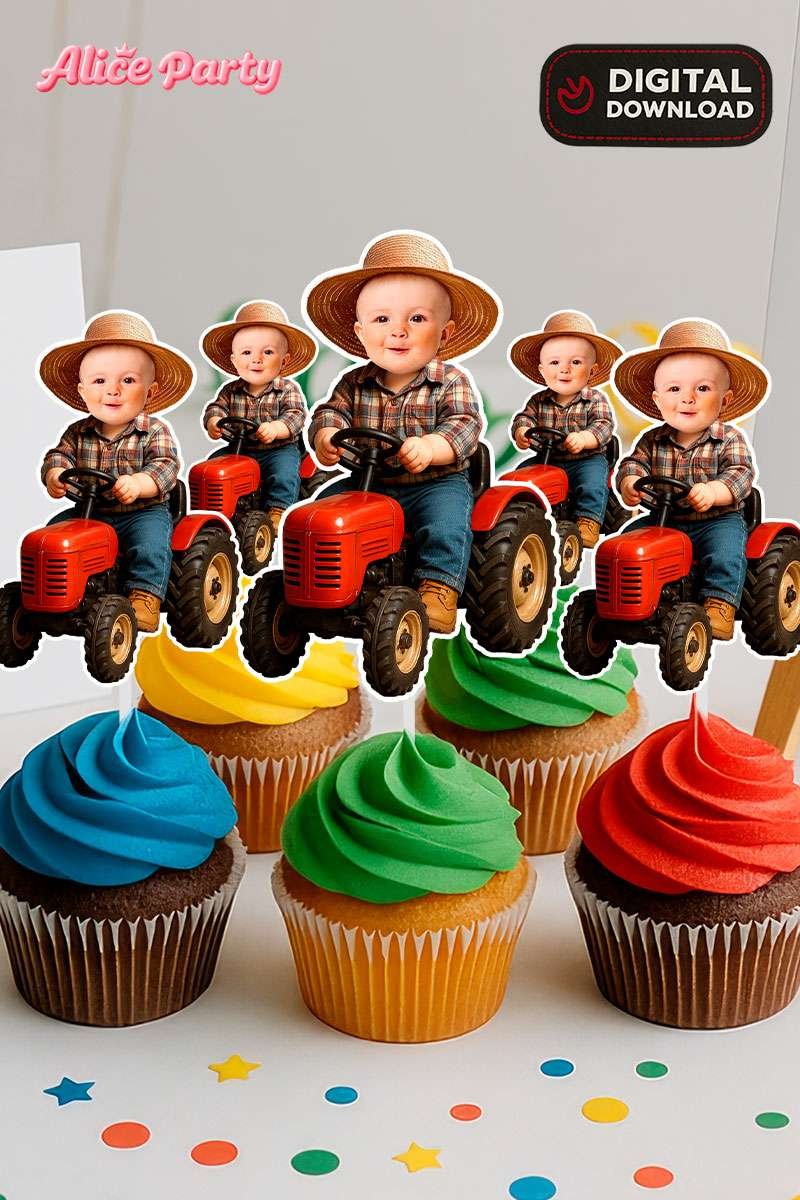 Turn your dessert table into the cutest little barnyard with these Custom Baby Farmer Cupcake Toppers — your child becomes the sweetest little farmer, dressed in tiny overalls, boots and a straw hat, ready to sit on top of every cupcake. These toppers are the perfect finishing touch for farm-themed birthdays, dessert tables, country-style parties, baby barnyard celebrations and those photo-perfect setups moms love.
