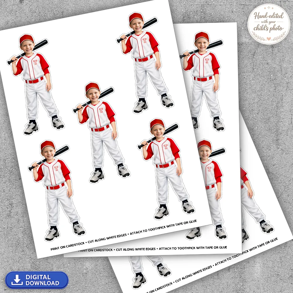 You’ll receive a high-resolution digital sheet of Baseball Cupcake Toppers personalized with your child’s photo. Each page includes 6 toppers per US Letter size (8.5×11 in). Delivered as JPEG (PDF available upon request).