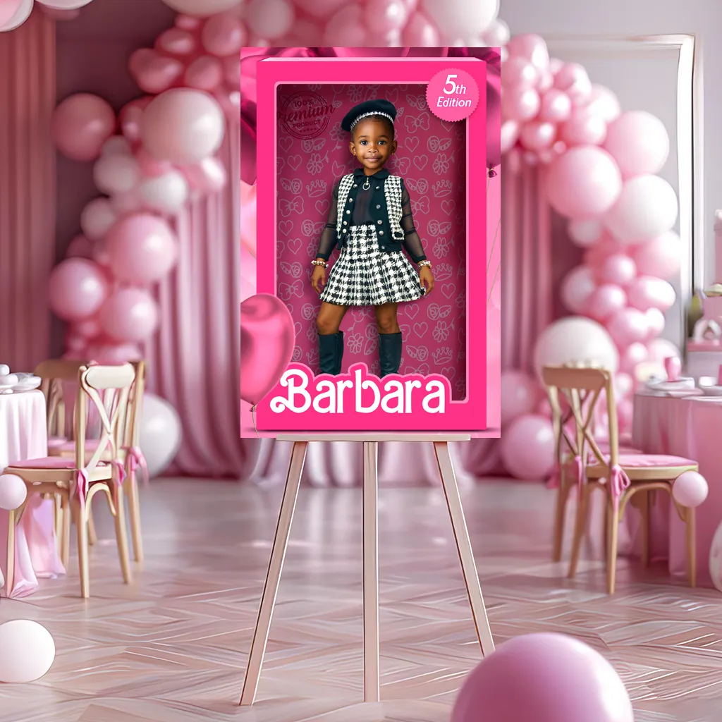 Create a picture-perfect party entrance with our Custom Doll Box Welcome Sign for Girls (Digital). This personalized welcome poster celebrates your daughter’s beauty and joy — designed with radiant tones, curly hair textures, and a bold doll box look that makes her the star from the very first step into her party!