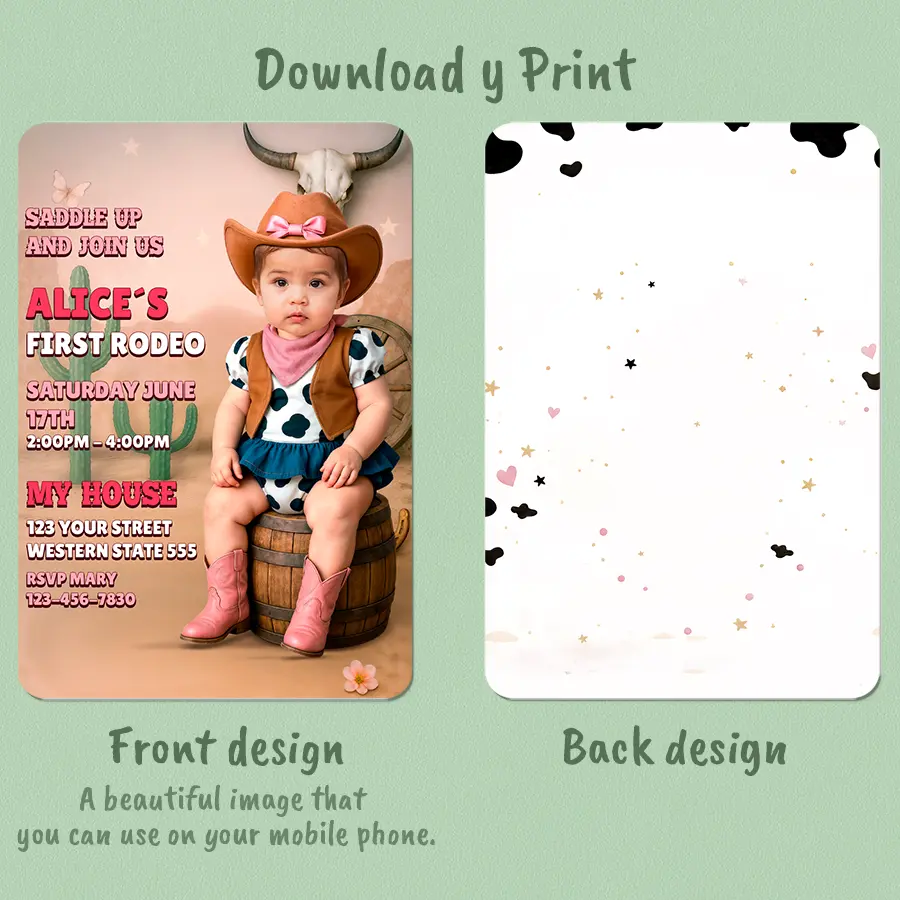 Each Custom First Rodeo Birthday Invitation for Girls (Digital) is created from scratch by an experienced designer. We don’t use automated filters or AI shortcuts. Every file is a one-of-a-kind creation, handcrafted with care to ensure your little cowgirl shines on her special day.