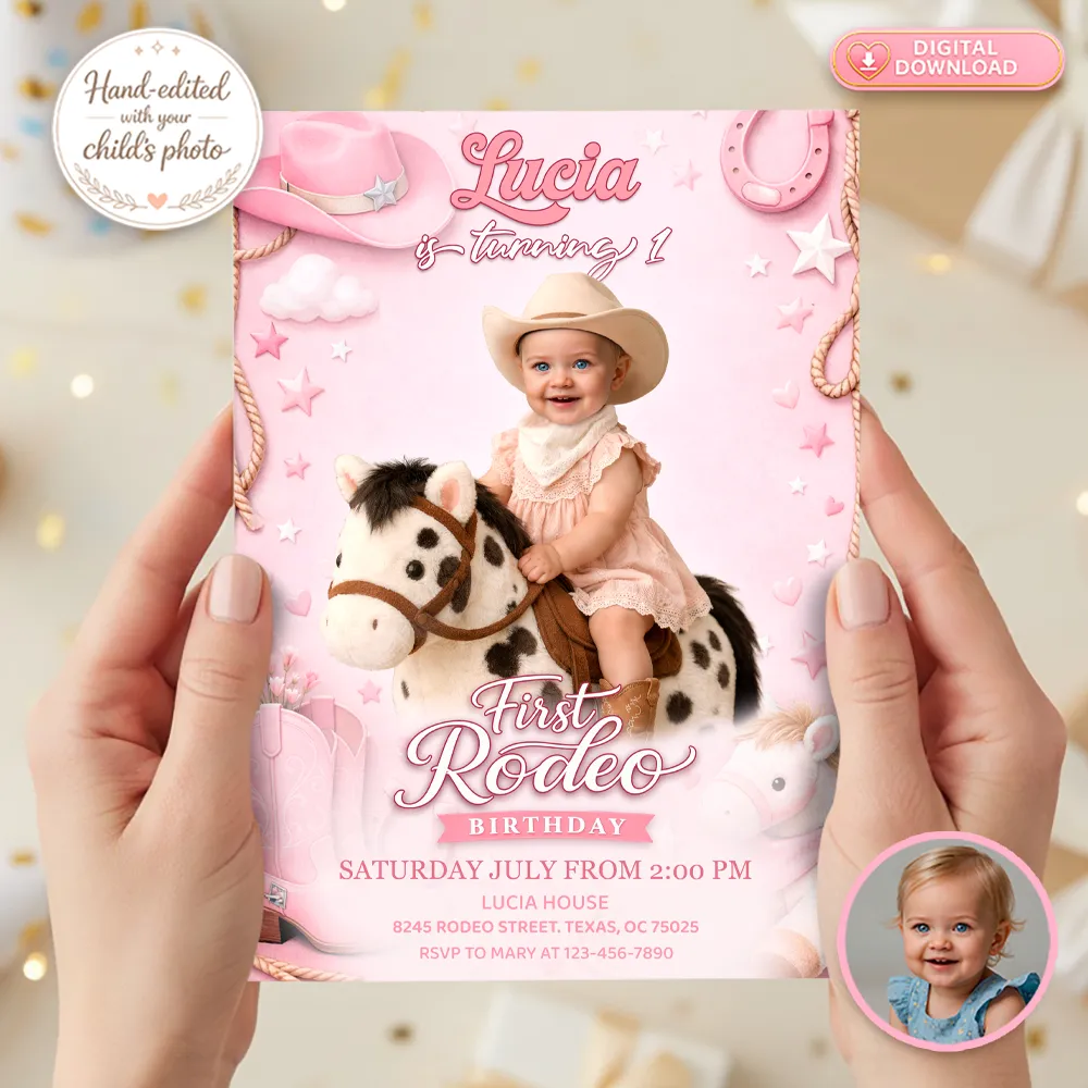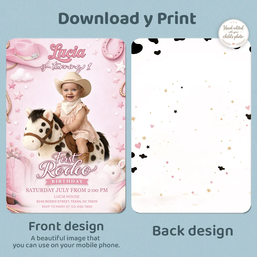 We take the stress out of the design process. With our professional manual photo editing, we don’t just put a face on a template; we carefully integrate your little cowgirl’s photo into the rancher outfit. The result is a high-quality, professional invitation that looks like a custom work of art.