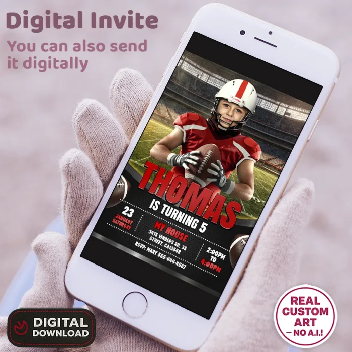 Make his birthday unforgettable with a Custom Football-Themed Birthday Invitation. Personalized with your child’s photo and favorite team, delivered fast and ready to impress.