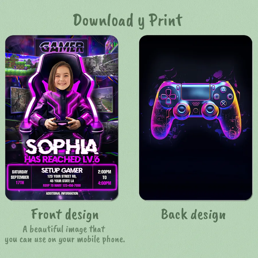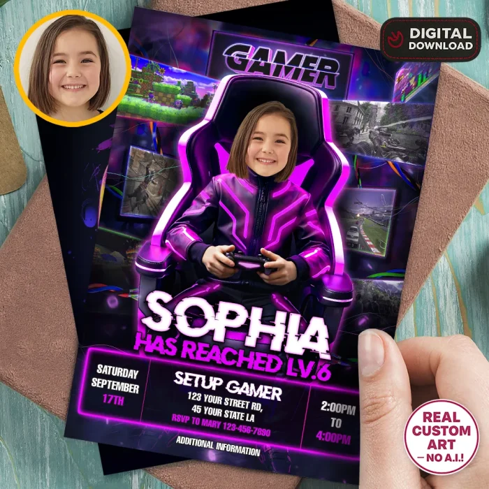 Custom Gamer Girl Birthday Invitation – Personalized Video Game Photo Invitation – Delivered in 24h – Digital File