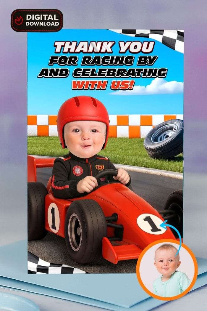 🏁 “Thank You at Full Speed!” with our Personalized Growing Two Fast Thank You Card (Digital). Designed to match your little one’s race car–themed celebration, this unique and fun digital card is the perfect way to wrap up your party with style and gratitude.
