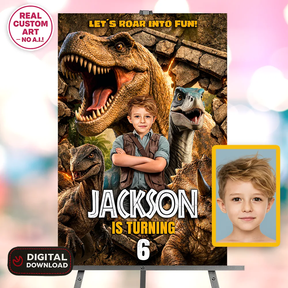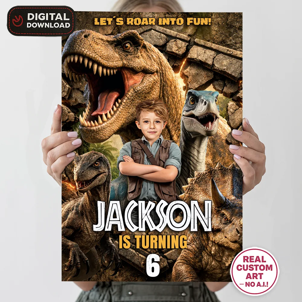 We are specialists in professional manual photo editing. We don’t just “drop” a photo into a template; our designers manually work on your child’s image to integrate it perfectly into the Jurassic landscape. We ensure the lighting, colors, and resolution are top-notch, making your little one the true star of the event.
