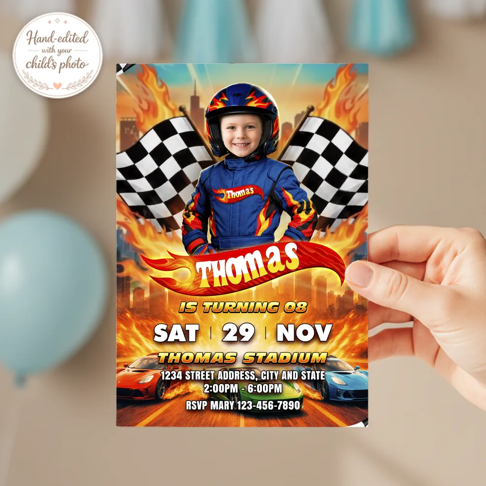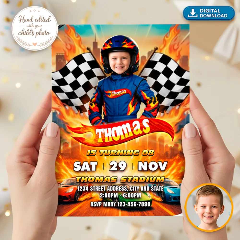 We pride ourselves on professional manual photo editing. Unlike other shops, we don’t use automated filters. Our designers carefully integrate your child’s face into the racing suit, adjusting every detail to ensure the lighting and perspective match the high-speed scene. The result is a high-resolution, professional invitation where your child is the undisputed hero of the race!