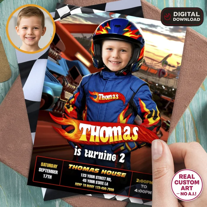 Unlike mass-produced templates or AI-generated files, every single invitation is hand-edited in Adobe Photoshop by a real designer. We take your child’s photo and seamlessly blend it into a custom racing scene, carefully adjusting lighting, colors, and proportions to make the design look lifelike, vibrant, and unforgettable.