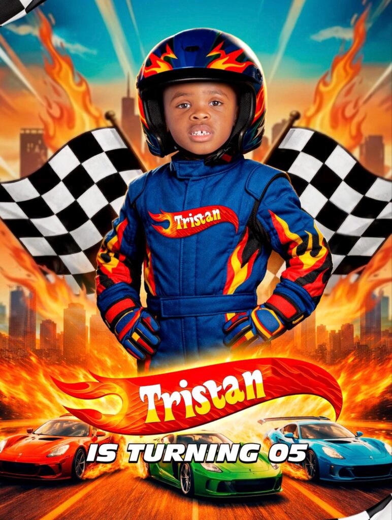 What makes our signs stand out? Our professional manual photo editing. We don’t just “paste” a face; our designers manually work on your child’s photo to integrate it perfectly into the racing scene, matching the lighting and vibrant colors of the track. No AI glitches—just a sharp, high-resolution masterpiece where your child is the star of the race.