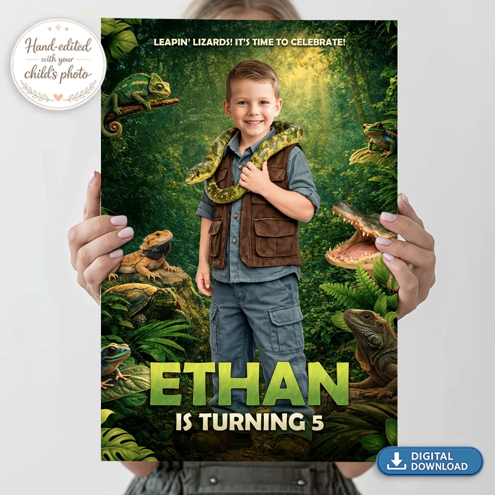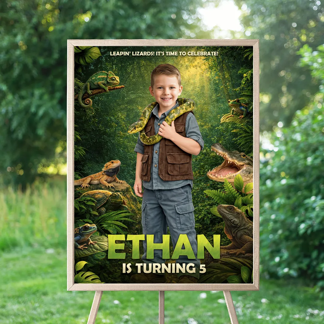 Get ready for a wild and exciting celebration! Our Custom Reptile Welcome Sign is the perfect way to greet your guests as they step into your child’s reptile-themed birthday party. Featuring your child as a fearless explorer surrounded by cool reptiles like lizards, snakes, turtles, and jungle textures, this personalized poster instantly sets the mood for an unforgettable adventure.