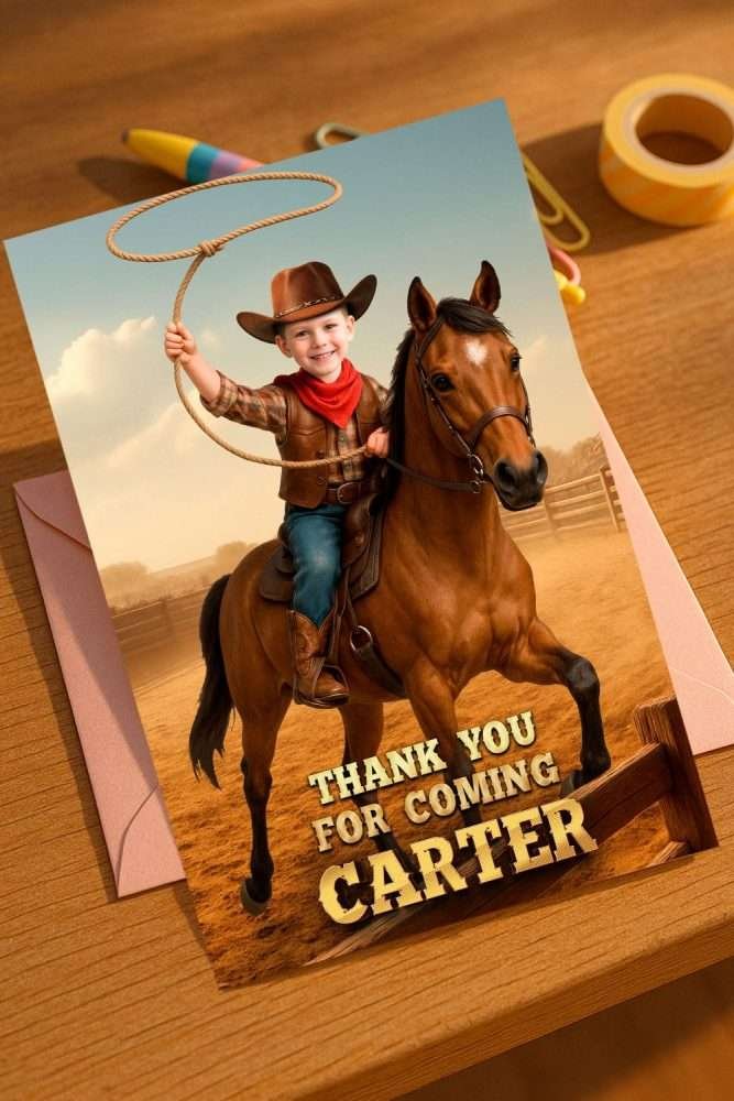 ✨ Finish your celebration with our Custom Rodeo Cowboy Thank You Card with Photo. Guests will love the thoughtful, personal touch, and you’ll love how it ties the cowboy theme together. More than a note, it’s a keepsake that reflects the fun, energy, and adventure of your child’s special day.